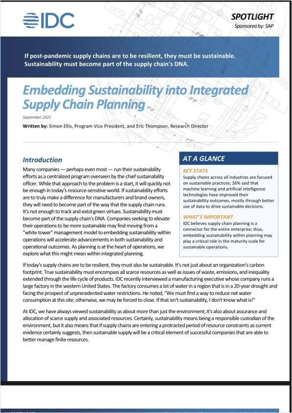 Learn why IDC believes that sustainability is an integral part of how companies run their supply chains and how integrated supply chain planning is at the heart of sustainable operations. |